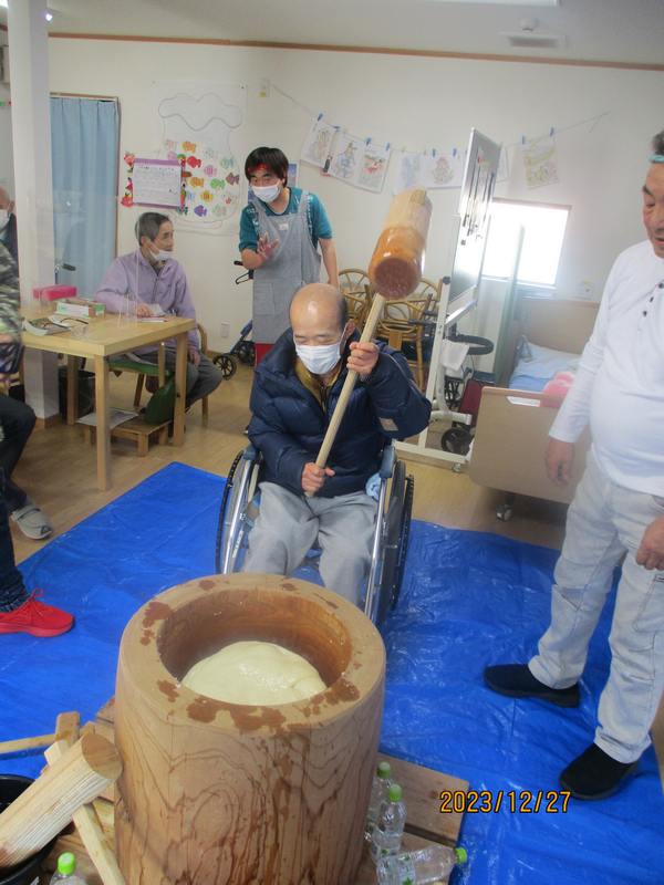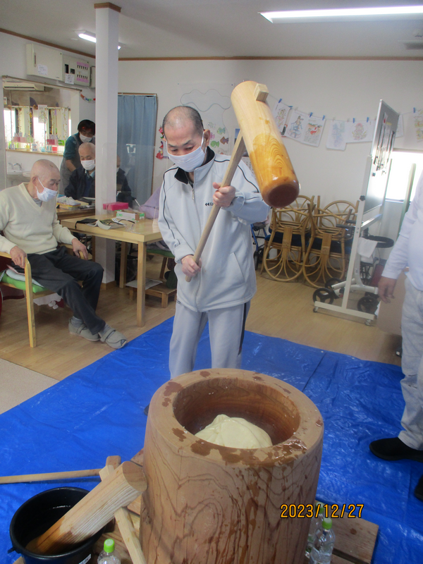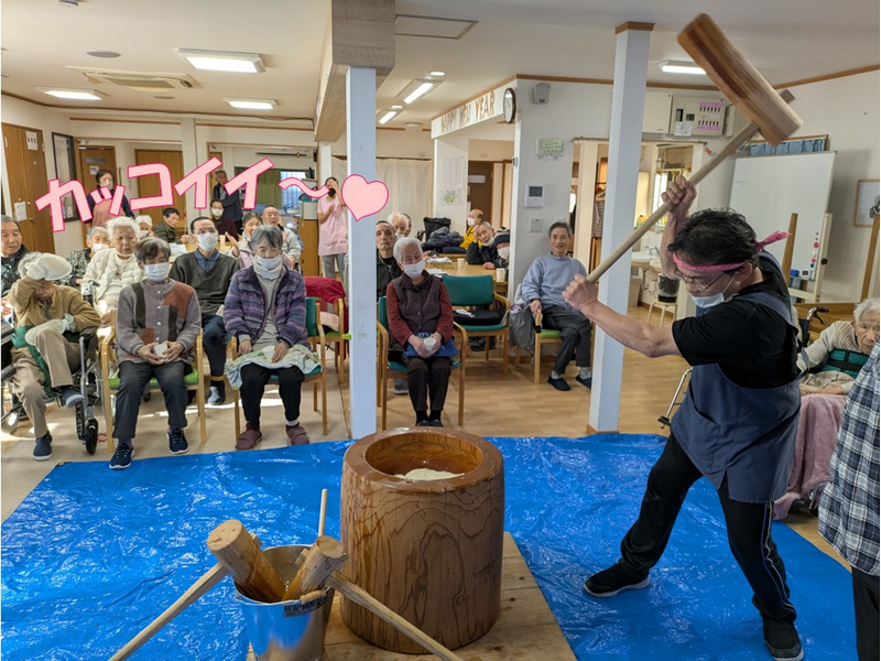 「1年元気に過ごせますように」と願いを込め、職員・ご利用者様一緒になって「ヨイショ!ヨイショ!」と掛け声をかけながら、力いっぱい餅つきを行います。
